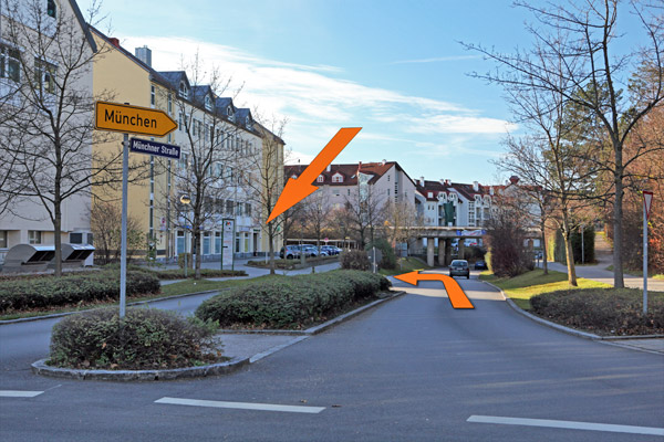 Über Münchner Strasse. Parkplätze befinden sich direkt direkt vor der Haustür (siehe Bild)
